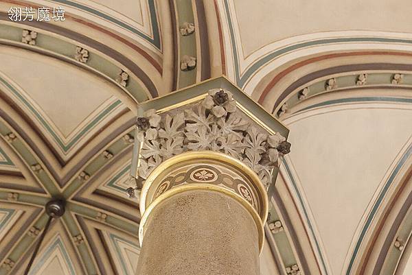 新哥特建築的特色是外觀保留哥特式建築的元素特色,裡面結構及功能卻是現代的,所以我們可以在中央咖啡館看到拱形天花板及廊柱,廊柱接頂的部分雕刻著簍空華麗的裝飾,是羅曼式建築的復古體現,店方以優雅來形容咖啡館的建築特色,我想是最佳形容了。