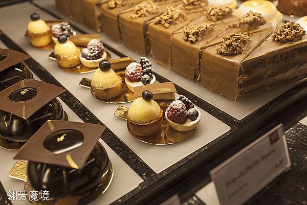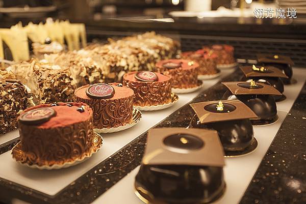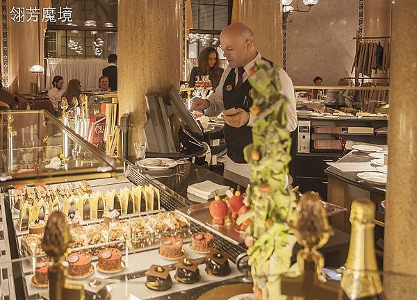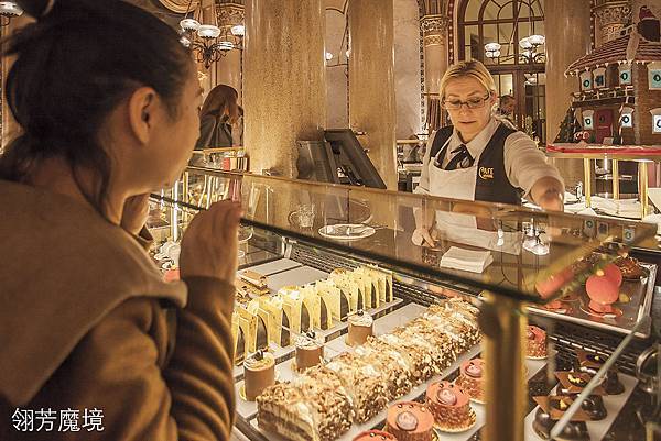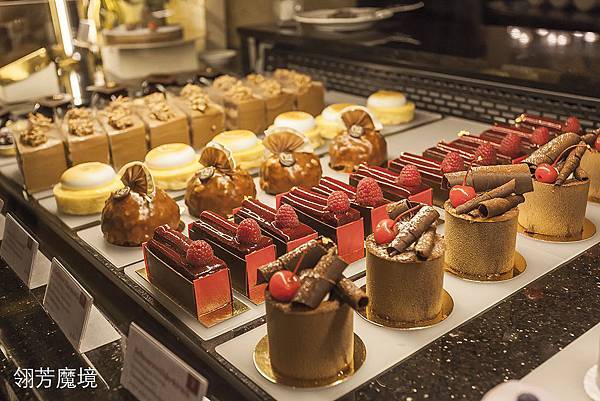 進到咖啡館,除了震攝於華麗優雅空間外,最醒目的就是位在中心區的甜點櫃,設在中心的用意很簡單,一來是方便外帶的客人選購,不會對店內其他空間的客人造成打擾,一方面也是視覺集中的焦點,那色彩繽紛、造型各異的各種甜點的確是吸人眼球,豐富多彩的景深疊層,加上奪目的甜點,實在令人無法抗拒。