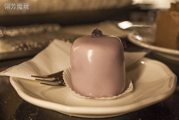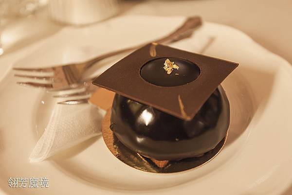 甜點翎芳老師選擇了schokozauber,這甜點是巧克力慕絲及香草奶油內餡,有點類似熔岩,只是把巧克力變成香滑的香草奶油,上面點綴一點食用金箔,不得不說歐洲人對甜食的講究還是挺高的,黏滑香潤的口感不說,光是巧克力就選用極佳品質的黑巧克力,當你一口輕輕咬開薄脆的巧克力外殼,裡面的香草奶油迸發而出,充滿滋潤香氣,在舌尖久久不散,足夠禰久。