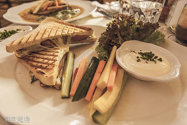 C′afe Central的Tafelspit以燉牛肉為主,搭配辣根的sauce,同時還有小茴香調味青豆、條狀蔬菜、土豆及洋蔥湯,由於牛肉片的頗薄,吃起來和正統的Tafelspit不太一樣,牛肉味道挺濃郁,土豆非常好吃!而Toast比較簡單,三明治裡面夾著烤牛肉,還有芝士、芝麻葉、番茄、雞蛋,當然也有輔助的黃瓜、蘿蔔、紅椒及黃椒切條,沾著sauce cream吃。