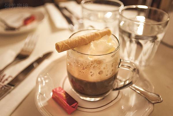 翎芳老師點的咖啡是其他城市少見,但在維也納卻很普遍的經典,Salon Einspanner,這個德語翻譯起來比較奇怪,叫做沙龍馬車伕咖啡,作法就是以Espresso加上大量的發泡奶油,有點類似康寶蘭,上面放根甜蛋捲,也附贈一塊巧克力,之所以名叫馬車伕,聽說是為了讓馬車伕駕車時能夠單手拉繮繩,另一手拿著咖啡享用,所以杯子較高方便單手拿取,而大量的發泡奶油除了提供豐富的熱量給馬車伕外,發泡奶油也能夠阻隔冷空氣接觸咖啡,使得咖啡必較不容易冷掉,喝的時候當然不需要像前人一樣奶油和咖啡隔著喝,而是建議一口熱espresso,一大口奶油同時混入口腔,甜苦混搭、冰熱相佐,風味絕佳!!