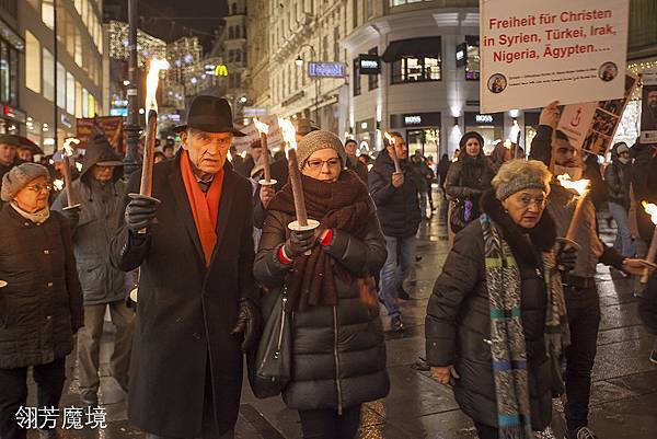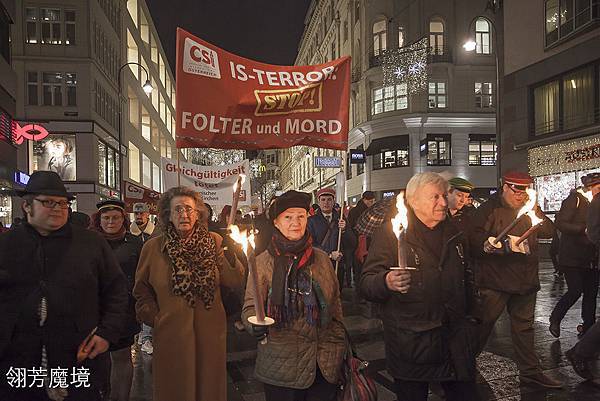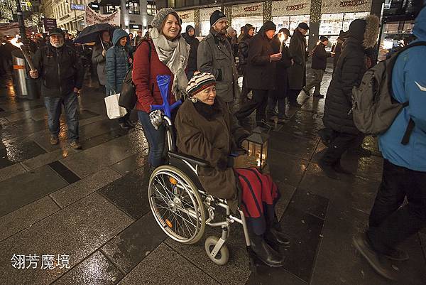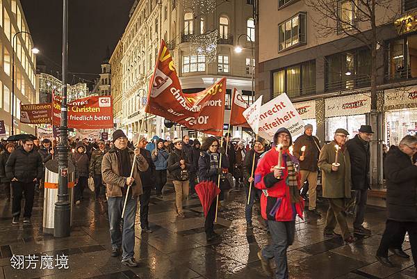 正巧在採訪當下,遇到了民眾的遊行,主要是抗議國際恐怖組織(is)的遊行,人不分老幼,舉著火把在微雨中遊行,更巧的是,幾天才發生俄羅斯大使被is組織在土耳其槍殺的新聞,以及瑞士日內瓦的聖誕集市被貨車衝撞的事件,讓今年的歐洲耶誕,蒙上了一層陰鬱的氣氛。